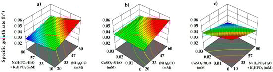 Moreover, the interactions between (NH2)2CO, NaH2PO4·H2O + K2HPO4, and CuSO4·5H2O and specific growth rates (h−1) were revealed by response surface plots (Figure 1). Varying the concentration of these factors causes a significant effect on the specific growth rates. According to the results, the model predicted the highest specific growth rates at approximately 60 mM of (NH2)2CO, 10 mM of NaH2PO4·H2O + K2HPO4 and 0.005 mM of CuSO4·5H2O.