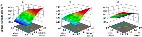 Additionally, the interactions between urea, other macronutrients, and the micronutrients and the specific growth rates were revealed by response surface plots (Figure 2).