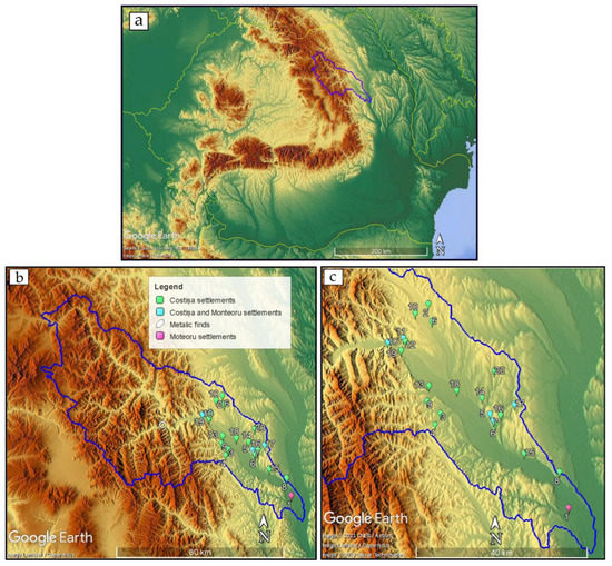 Bistrița River basin: (a) localization on Romanian territory; (b) discoveries specific to the Middle Bronze Age; (c) Costișa and Monteoru sites (1. Bacău—Mărgineni; 2. Bodeștii de Jos—Cetățuia Frumușica; 3. Borlești—Dealul Cucului/Dealul Nucului; 4. Borlești—Dealul Runcu; 5. Costișa—Dealul Bisericii/Piciorul Moenii; 6. Costișa—Dealul Stanciului; 7. Costișa—Cetățuia; 8. Itești—Lac Lilieci; 9. Luminiș—Deleni; 10. Piatra-Neamț—Bâtca Doamnei; 11. Piatra-Neamț—Lutărie; 12. Piatra-Neamț—Pietricica; 13. Piatra Șoimului—Horodiștea/Capul Dealului; 14. Podoleni—Dealul Teiului; 15. Racova; 16. Siliștea—Vatra Satului; 17. Siliștea—Pe Cetățuie; 18. Traian—Dealul Fântânilor; 19. Văleni—Cetățuia; 20 Hoisești—La Curmătură 1).