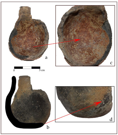 The first case study is represented by Piatra Neamț—Bâtca Doamnei, the settlement (Neamț County; Figure 1(10), Figure 3(3), which is located on an isolated hill on the right bank of Bistrita River (GPS: N 46°55′22″; E 26°19′22″). At this location is a well-known Dacian fortification (Iron Age), but traces of habitation on this plateau date back to the Eneolithic. Additionally, here were discovered artifacts attributed to the Middle Bronze Age and the Early Middle Ages, but without data related to stratigraphy or archaeological complexes, the site being mostly affected by subsequent human interventions [37]. As for the Middle Bronze Age habitation, this is represented by Costișa and Monteoru ceramic materials [26,37,38], without any housing structures being mentioned. In addition to the pottery, from the Piatra Neamț—Bâtca Doamnei site, there is also a mention of a gold ring that was discovered outside the settlement, on the western slope [37], attributed to the Middle Bronze Age communities. Moreover, from this settlement was recovered a miniature vessel [26]; the macroscopic analysis showed a reddish layer on the inner surface and several smaller spots of the same color on the outside (Figure 5).
