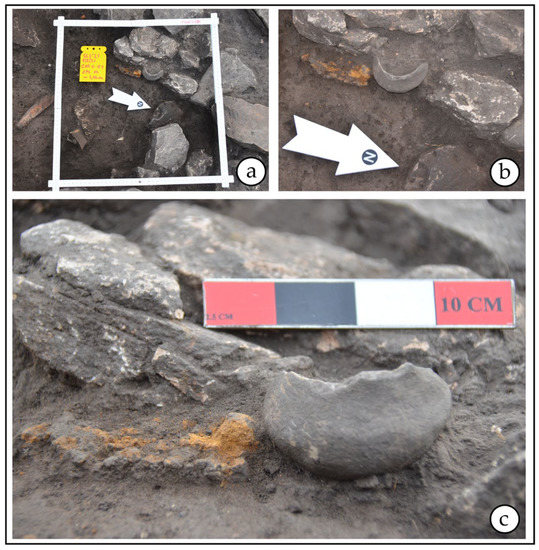 The second case study is represented by the site from Siliștea—Pe Cetățuie (Români commune, Neamț County; Figure 1(17), Figure 3(5) which is located on a high promontory (GPS: N 46°47′43.81″; E 26°43′33.00″), with good visibility toward the surrounding landscape [40]. The settlement is naturally protected on three sides by steep slopes; the defensive system was completed with an anthropogenic ditch of appreciable dimensions [5]. Here, a single habitation layer was discovered, in which archaeological materials of Costișa and Monteoru archaeological cultures were discovered, with no stratigraphic differences, thus indicating cohabitation of the two contemporary Middle Bronze Age communities [5,16]. During the archaeological research from Siliștea—Pe Cetățuie settlement (2000-present), several unburned rectangular housing structures were discovered, represented by large-sized sandstones that formed the basis of some supporting pillars, along with red-burnt sandstones and fragments of adobe and ceramic fragments [41]. Additionally, elements were discovered that indicate the practice of a foundation ritual of these constructions. In this sense, four such situations were discovered in which, under the large-sized sandstones, were whole pots or in situ broken vessels, together with animal osteological remains that represented fragments of meat offerings [19,41,42,43,44]. As for the archaeological materiality in this settlement, there are a multitude of bone artifacts (awls, pendants, arrowheads); stone artifacts (axes, curved knives/Krummesser, arrowheads, grinders) and clay fragments (spindle whorls) [42]; several metal objects, represented by six Noppenringe [18,40,41]; and a simple ring, a bracelet and a small ring fragment [43]. The metal pieces showed similarities with those from Central Europe, thus illustrating the existence of contacts or relationships of the eastern Carpathian communities with the Middle Danube area [22]. Regarding the pottery, complete functional packages were identified for both communities, but for the Costișa pottery several miniature vessels were discovered, one of them being in a special context, in the proximity of the hearth, considered the “heart” of the dwellings, next to a lump of yellow ochre (Figure 6), which may explain the functionality of these containers. Moreover, a consistent amount of whitish material remains, represented by calcium carbonate, which was also identified near the hearth [43]. The macroscopic analysis of the vessel from Siliștea—Pe Cetățuie did not provide a series of data as complex as those from Bâtca Doamnei, an aspect determined by the need to keep the vessel intact for analyzing the contents. However, it was found that the vessel had been broken almost in half since ancient times, without being able to make assumptions about the intentionality of this damage. In terms of manufacturing technology, the pot was found to have a carefully finished exterior, most likely fired in a reducing atmosphere. The archaeometric observations related to the vessel from Siliștea—Pe Cetățuie could not be carried out, an aspect determined by the impossibility of sampling, but the information could be extrapolated from those obtained from the Bâtca Doamnei settlement, assuming a similar temperature range. Additionally, based on a ceramic assemblage from this settlement that was analyzed in a previous study [45], it was possible to establish that most of the vessels were fired at temperatures between 700 and 750 °C.