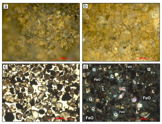 OM images of yellow pigment in reflection (a,b) and transmission (c,d) (50 and 100× magnification): Q—quartz; FeO—iron oxide; L—limonite (c)—parallel Nicols; (d)—crossed Nicols.