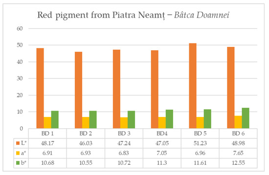 CIE L*a*b* colorimetry for the red pigment from Piatra Neamț—Bâtca Doamnei.