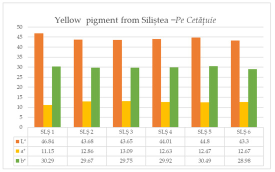 CIE L*a*b* analysis was performed on six areas for each pigment sample. Thus, in the case of both samples, the highest values are L* (luminosity), which are between 43 and 51, and the values of the coordinates a* (green–red axis) and b* (blue–yellow) vary depending on the sample. In the case of the red pigment from Bâtca Doamnei, the values of the two coordinates are close, a* having values of 7 and b* of 12 (Figure 11). On the other hand, considerable differences are noticed in the case of the yellow pigment, where the values of the a* coordinate are 13, and those of the b* coordinate are 30 (Figure 12).