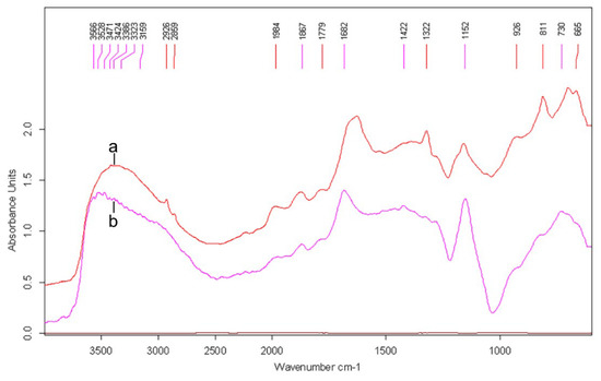 In addition to the peaks attributed to absorbed water [51,52], such as those in the range 4000–3000 cm−1 and at 1682 cm−1, the one specific to kaolinite [46,51,53] at 3528 cm−1 is highlighted.