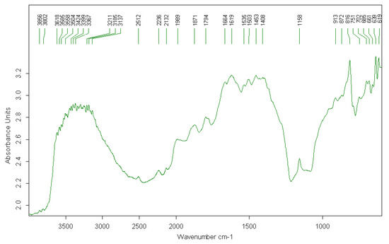 Carbonates [50,60] are visible by the presence of several peaks in the range 1300–1500 cm−1, and calcite is visible at 2512 and 872 cm−1 [56].