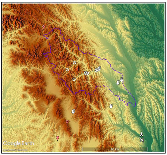 The study area is within eastern Romania, mainly the Subcarpathian area of Moldavia, which includes the hydrographic basin of the Bistrița River (Figure 1a) and the geographical unit called Cracău–Bistrița Depression, where the Middle Bronze discoveries are grouped (Figure 1b). Owing to the particularities of the relief and natural resources [2], such as fertile soils and pastures, but also salt springs [3], this area was intensively frequented in prehistoric times [4]. The Bistrița Valley is also an important hydrographic artery of the Subcarpathians, so some sectors register a high density of settlements. It also represents an important communication route [5] that connects the east and the west of the Eastern Carpathians, benefiting from smaller communication arteries, branched on either side of the main valley.