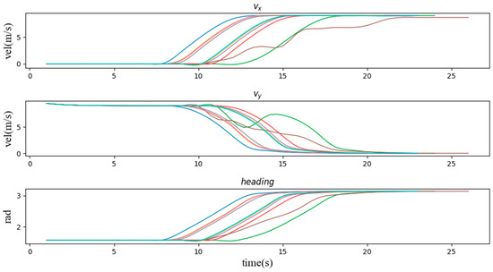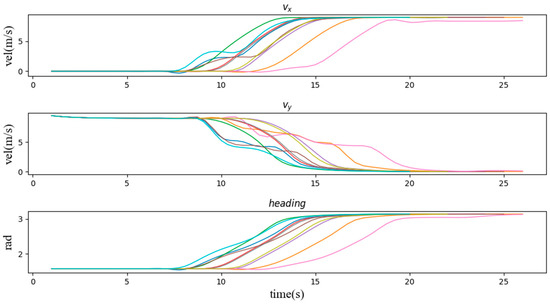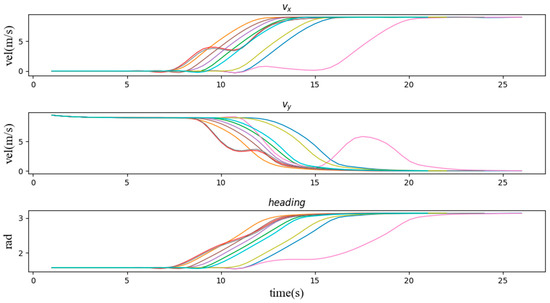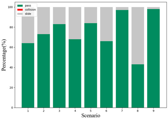 Second, we verify the speed and heading angle graphs in three types of scenarios. From the graphs of the speed variation over time in these three types of examples, the vehicle entering the intersection from the right side of the intersection has the least impact on the vehicle. It can be seen that most of the speed lines change evenly, which represents most situations. The vehicle can easily pass through the intersection without being affected by other vehicles, and the green line shows that the vehicle is waiting for the other vehicle to pass the intersection while coasting at a reduced speed, and then quickly increases the speed to pass through the intersection. Similarly, Figure 9 and Figure 10 also have typical lines that wait for other vehicles to pass the intersection and then speed up to pass through the intersection. Among them, we noticed that the brown line corresponds to the scene where the vehicle is followed by another car after passing the intersection, which is similar to the operation of a skilled human driver. In most other cases, the vehicle maintains the current speed for a while, and then quickly passes through the intersection. Figure 11 can also support this point, the pass rates of scenarios 1 to 9 are 64%, 73%, 83%, 68%, 84%, 66%, 97%, 47% and 98% respectively. The results show that the impact of the left car on the target vehicle is greater than that of the right car, because the pass rates of scenarios 1, 4, and 7 are lower than those of scenarios 3, 6, and 9, respectively. However, the pass rate of scene 8 is much lower than that of other scenes, which means that the situation where the oncoming vehicle in front of the intersection turns left is much more dangerous than other scenes.