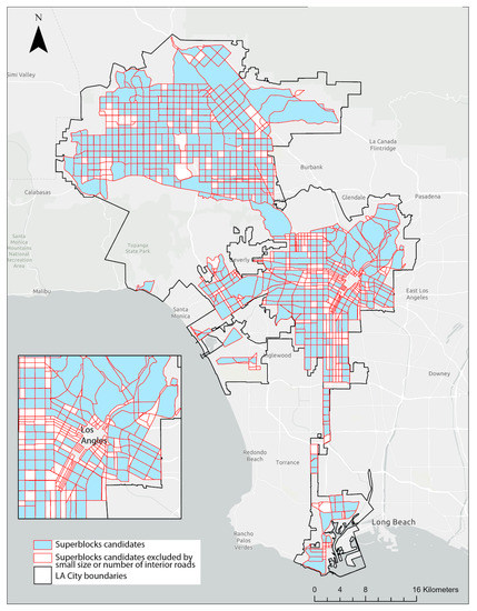 The LA Superblocks Model proposed in this study prioritized the potential Superblock locations in the City of LA with the help of the five data-driven rules. Defined by these five rules, we used the term Superblocks to refer to a sufficiently large urban area surrounded by major streets or arteries. In order to allow that at least one local street runs between the local main streets and the arteries that border the Superblocks, previous studies have established quantitative standards such as: (1) the minimum schematic expression of Superblocks with local traversing main streets is a 3 × 3 street grid with four internal blocks; and (2) the minimum schematic expression of Superblocks with additional internal streets is a 5 × 5 street grid with 16 internal blocks [28]. Thus, a generalizable Superblocks model must include size in its design. In this LA Superblocks Model, we chose 100,000 square feet and 12 road segments as the thresholds to filter the Superblock candidates to ensure the minimum schematic expression of the Superblocks in the model is greater than a 3 × 3 street grid. However, we suggest future investigations into different types of schematic expression of Superblocks to extend this model to other metropolises.