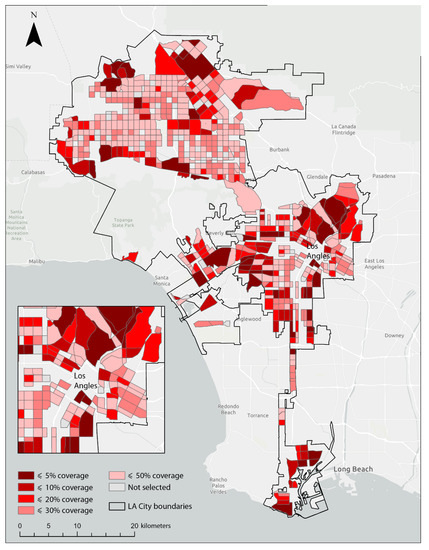 The City of LA is the second-largest city in the United States and well known for its sprawling metropolitan area, traffic congestion and traffic related air pollution (TRAP) [10]. In addition, the presence of two major seaports and the associated goods movement infrastructure creates additional emissions from diesel vehicles [11,12,13]. To counter the adverse health impacts of air pollution, the City of LA has explored the use of transit malls, people-first streets and superblocks to reduce gasoline-powered automobiles and diesel freight vehicles passing through neighborhoods, TRAP, noise and the urban heat island effect [14]. Some preliminary modeling by Fitzgerald et al. [15] to predict the health benefits of these interventions has been undertaken, but their work is limited because their proposed Zero Emission Areas (ZEAs) were few in number and modest in terms of areal extent. In this study, we aim to build a more powerful series of arguments for implementing superblocks on a larger scale across the City of LA.