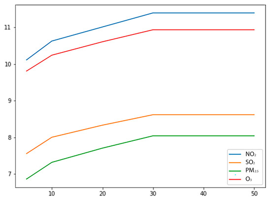 We built and ran the BenMap-CE model as described in Section 2.3 and calculated the avoided hospital administrations due to the projected air pollutant reductions. We then extended the BenMap-CE model to translate the health benefits indicated by the reduction of hospital admissions to economic values in dollars. After that, we summarized the annual amounts saved from avoided hospital admissions for each air pollutant under the five residential area transformation scenarios. Figure 4 shows the spatial distributions of the annual hospital admissions avoided due to the air pollutant reductions estimated by the BenMap-CE model and Figure 5 shows the annual ln($) saved from hospital admissions avoided due to the air pollutant reductions under the five Superblocks scenarios. We found that the economic benefits indicated by annual values saved from hospital admissions increased the fastest when 5–10% of the residential areas were transformed and the rate gradually decreased afterwards and became less perceptible when 30–50% of the residential areas were transformed.