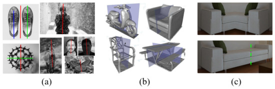 - Funk, C.; Lee, S.; Oswald, M.R.; Tsogkas, S.; Shen, W.; Cohen, A.; Dickinson, S.; Liu, Y. 2017 ICCV Challenge: Detecting Symmetry in the Wild. In Proceedings of the 2017 IEEE International Conference on Computer Vision Workshops (ICCVW), Venice, Italy, 22–29 October 2017; pp. 1692–1701. [Google Scholar] [CrossRef]