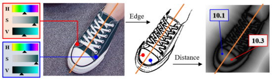 For robustness and speed in practical use, we choose the HSV (hue, saturation, value) color space to describe the pixel p itself, noted as . We use the DT (distance transform) values as a kind of texture descriptor near the pixel p, noted as . The combined descriptors are constructed as:
