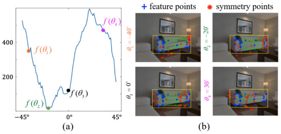 Estimation of orientation by minimizing the cost function. (a) The cost function value with respect to orientation angle. (b) The corresponding symmetry points under different angles. The top right is where the function reaches the minimum.