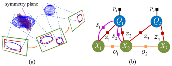 The problem can also be formed as a factor graph, including nodes composed of objects and camera poses and edges composed of observation constraints, as in Figure 5, where X is the camera poses and Q is the objects in the map. z is the camera-object observation constraint, o is the odometry constraint; both were described in detail in [11]. s is the newly added 3D symmetric constraints and will be emphasized in the next subsection.