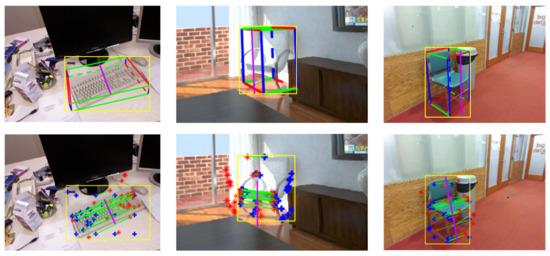 The measurement results of our method and [10] using the same images are shown in Figure 7. Since the orientation measurement method of [10] relies mainly on the vanish points of straight-edged lines, its results will be inaccurate when there is too much texture inside the object (TUM-keyboard) or when the edges of the object are curved (ICL-chair). On the contrary, our method can still obtain the exact orientation in the above cases, because the symmetry property still exists. However, we also found some failure cases, such as the third column of Figure 7, where the chair was mistaken for a diamond shape by our method and, in turn, received an incorrect estimated orientation, due to the ambiguous information of the single frame observation.