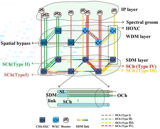 In Figure 1, the optical layer can be divided into an SDM layer and a WDM layer, and the optical nodes are considered as HOXCs, consisting of WXCs and SXCs in SCNs. To meet the functional requirements of SCNs, it is necessary to design HOXC architectures that are reliable, growable, and flexibly connected. Four SXC architectures have been designed, namely full-size matrix-switch-based SXCs, sub-matrix-switch-based SXCs, full-size core-selective-switch-based SXCs, and sub-core-selective-switch-based SXCs [12]. The SCNs in this paper use sub-core-selective-switch-based SXCs, the advantages and disadvantages of which are described in detail in the following content. The pros and cons of other types of SXCs are not discussed here.