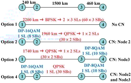 - Option 1: no CN is set between node 1 and node 4, i.e., no MFC is performed on the entire routing path. The MF is selected based on the distance from node 1 to node 4, which is 2200 km in Figure 3. From Table 2, BPSK (supporting 100 Gb/s) should be selected as the MF, so SBs are required to carry A on all links, implying that SLs are occupied;