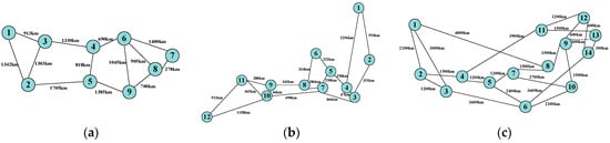 (a) Simple mesh network topology; (b) Japan network topology; (c) NSF network topology.
