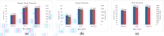 (a) The number of occupied SLs and SBs for the LBMSA algorithm, the KSP algorithm, and the KSP-CNs algorithm in the simple mesh network; (b) The number of occupied SLs and SBs for the LBMSA algorithm, the KSP algorithm, and the KSP-CNs algorithm in the Japan network; (c) The number of occupied SLs and SBs for the LBMSA algorithm, the KSP algorithm, and the KSP-CNs algorithm in the NSF network.