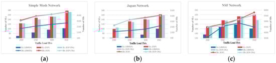 (a) The number of occupied SLs and SBs for the different traffic loads in the simple mesh network; (b) The number of occupied SLs and SBs for different traffic loads in the Japan network; (c) The number of occupied SLs and SBs for different traffic loads in the NSF network.