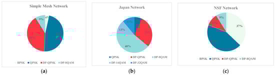 (a) Utilization of the modulation formats in the simple mesh network; (b) Utilization of the modulation formats in the Japan network; (c) Utilization of the modulation formats in the NSF network.