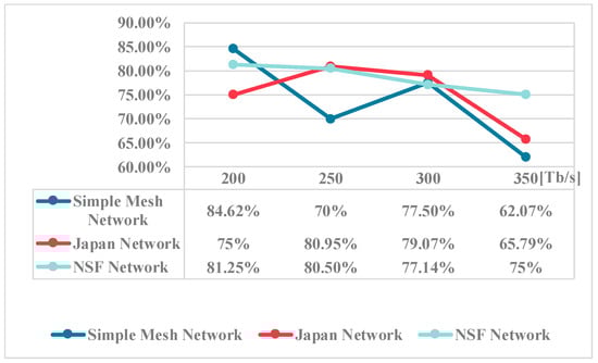 In Figure 7 and Figure 8, the utilization of MFs and MFC in three network topologies is analyzed. We obtained the number of traffic requests that were not end-to-end requests under different traffic load scenarios and calculated the percentage of those traffic requests that performed MFC. It can be obtained that the adoption of different MFs and MFC is related to the average SDM link length of the network topology and the use of MFC is also related to the total traffic rate. In the simple mesh network topology, QPSK and DP-QPSK (with maximum achievable transmission distances of 1000 km and 2000 km, respectively) are used most frequently because of the average SDM link length of 1063 km and the small SDM link length variance. As a result, in Figure 8, multiple CNs are set up to perform MFC to carry traffic requests using more efficient MFs. When the total traffic rate is 200 Tb/s, the percentage of traffic requests performing MFC even reaches 85%. This also proves that when the traffic attempt rate in the network is small, the LBMSA algorithm takes maximizing network resource utilization as the primary goal. Since the average SDM link length of the Japan network topology is small, more efficient MFs, such as DP-8QAM, DP-16QAM, and DP-32QAM are effectively utilized. Meanwhile, the SDM link length variance in the Japan network topology is large, so CNs and MFC are used more frequently than in the simple mesh network topology. This is why the number of SLs and SBs occupying the Japan network topology is always less than that of a simple mesh network when the traffic rates are the same. The average SDM link length in the NSF network topology is 1936.36 km, therefore, the inefficient BPSK and QPSK are used many times, which is consistent with the analysis above. LBMSA always saves more network resources, compared to the other two algorithms and is particularly prominent in small-scale networks. When the size of the network is small, insufficient spectrum resources are the only reason for blocking. In addition, as can be seen in Figure 8, the percentage of traffic requests using MFC is above 75% for different traffic load cases. The high frequency of using MFC is also an important reason for the efficiency of LBMSA. The use of MFC tends to decrease as the traffic load increases. In all three network topologies, the use of MFC is minimal when the total traffic rate is 350 Tb/s. This is because when the network traffic load increases, the LBMSA algorithm is more inclined to carry all traffic requests rather than efficient transmission.