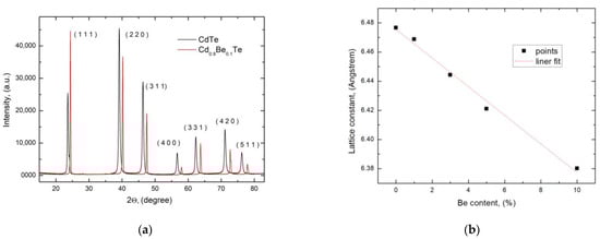 The XRD patterns of example CdBeTe mixed crystals (CdTe and Cd0.9Be0.1Te) powdered are presented in Figure 1a. Characteristic diffraction reflections from (111), (220), (311), (400), (331), (420), and (511) planes of the cubic phase (type of zinc blende structure) are visible on the patterns for both CdTe (black) and Cd0.9Be0.1Te (red) samples. In the case of a mixed crystal, the diffraction peaks are shifted towards higher 2 θ in comparison to the position of these signals in the CdTe. Such behavior demonstrates the presence of mixed crystals, so the beryllium was successfully incorporated into the crystal lattice of CdTe. The absolute values of the lattice constant were calculated by the Rietveld method and the results that were obtained as the function of the composition are displayed in Figure 1b. Linear dependence of the lattice constant versus Be content confirms the composition of the grown crystals.