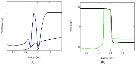 First, cut and grounded samples were examined. Figure 2 presents the experimental amplitude (blue) and phase (green) spectra of Cd0.97Be0.03Te in the rear configuration at the frequency modulation of 126 Hz. In both spectra, the theoretical simulations for the ideal sample are presented (in black). The different characters of both experimental and simulated spectra are visible. There are two additional maxima in the sub-bang gap region for the amplitude and the significant change (at the energy of E = 1.46 eV) of the phase in the same area. The amplitude signal in the above bandgap area is increasing in comparing stable values in simulated amplitude spectra. Similar behavior was previously observed for Zn1−x−yBexMnySe compounds [19]. It was associated and interpreted as coming from the defects located on the surface of the sample and strictly connected with the method of surface preparation.