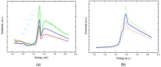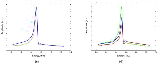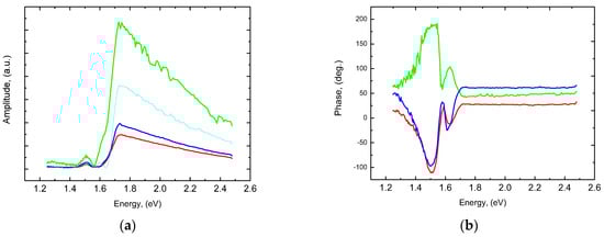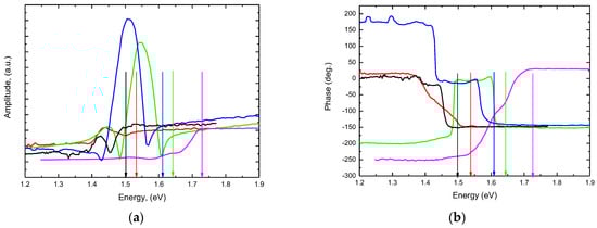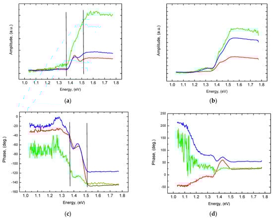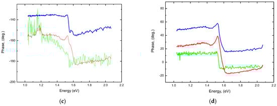 The expectation was to obtain the spectra close in shape to the ideal crystal (black in Figure 2). The applied method of etching did not improve the surfaces of the sample. In the amplitude spectrum, an additional maximum still exists below the energy gap, which is not expected for an ideal sample. Although the phase has a different shape, it is worth noting that phase changes take place at the same energy values (indicated in the figure with vertical lines). This proves that the defects on the surface were present at a different depth of the damaged layer (by etching) or that additional effects had been achieved, e.g., with phenomena associated with the carriers. The same changes in phase are manifested differently in amplitude; with different maximums, it is also worth emphasizing that piezoelectric spectroscopy allows for studying the differences on both surfaces of the sample prepared with the same treatment procedure.