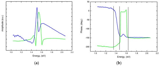 Amplitude (a) and phase (b) spectra for the ground (green lines) and etched (blue lines) Cd0.95Be0.05Te sample at 126 Hz of modulation frequency.