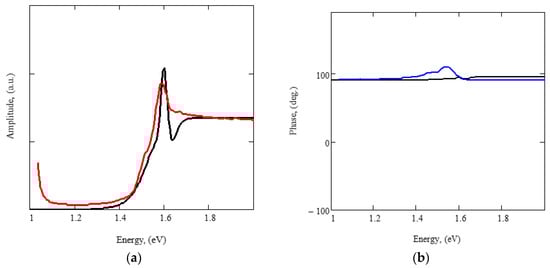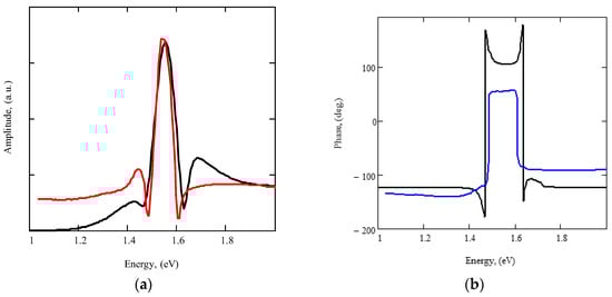 Amplitude (a) and phase (b) spectra of the ground Cd0.95Be0.05Te mixed crystal for 126 Hz modulation frequency. Simulated spectra are presented by black lines, experimental amplitude by red lines, and experimental phase by blue lines.
