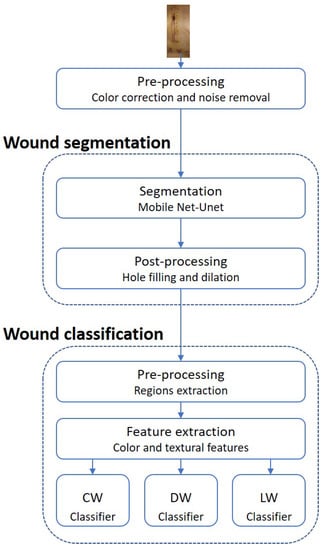 The better performances by the LW and CW can be interpreted by the more considerable visual variances between the positive and negative classes, where the alterations of the wounds are more visible than in DW. It also corroborates that characteristics that indicate wound alterations can differ for each wound type, confirming the need to separate the wound classification problem into three classifiers.