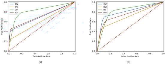 From all model types, the DW classifiers had the worst performance for both metrics, while LW achieved the best scores. Regarding the F1-optimization, DW obtained poor results, below 50%, for precision, recall, F1, and F2. The performance slightly improved for the F2-score, reaching a recall of 68.4%; however, the remaining metrics, except accuracy, still showed bad results. The poor results for the DW classifier can have two possible explanations: the significant discrepancy in the number of data samples between classes in the test set and the few differences presented between characteristics of positive and negative classes. The quantity of DW that has an alteration is low, meaning there are few examples of DW alterations. In CW, the scores already surpass the 50% barrier, except for the precision for the F2-optimization. The differences between F1 and F2 scores for both optimizers are low, while precision and recall are higher. Ultimately, the LW showed a higher overall score for all metrics and a recall of 87.6% for the F2-optimizer. However, it has the worst accuracy, which may be because LW has the lowest ratio between positive and negative classes; as such, the accuracy metric is less biased and corresponds more to reality.