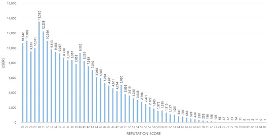 Figure 2 shows the distribution of reputation scores among Steem blockchain network users. In general, there are many users in the low-score range, which may be due to the method of calculating the reputation score from the raw-reputation data of the Steam network.