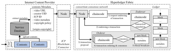 When a user uploads a video through the ICP to which he or she belongs, the video data are stored in the database server of the ICP [29]. After ICP extracts and signs metadata from video data, it executes the registration chaincode for metadata registration as a client through nodes connected to the blockchain. The chaincode is installed on the peer node, and the chaincode execution transaction is transmitted to the endorser of the other peer node to receive endorsement of the safety of the chaincode before sending it to the orderer. The orderer generates blocks based on the consensus algorithm and sends them to peers. The peer’s anchor receives the block sent from the orderer, confirms the block through the committer, and updates it on the blockchain. ICP extracts the metadata of these contents and registers them with the signature of the service on the blockchain ledger. The metadata registration process is performed by the ICP as a single unit by collecting the content registered by the user of the corresponding service.
