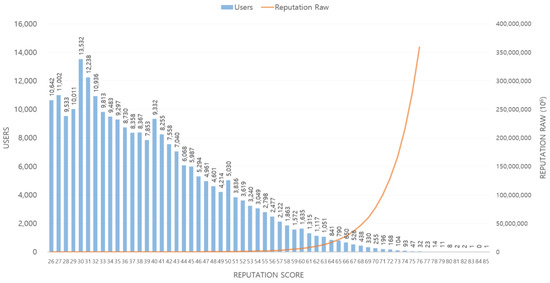 Figure 7 shows a graph of the reputation raw-reputation score in the Steem blockchain network that operates a reputation-based content management system through Equation (2), which is the reputation calculation formula of the proposed system. The graph shows the results of analyzing the reputation data of 242,361 Steemit community users recorded in the Steem network. The reputation raw-reputation score rises in proportion to the index, and the reputation raw in the high score range shows a very large difference.