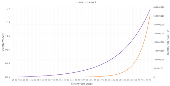 Voting based on collective intelligence using user participation requires a method to resist voting manipulation by malicious users. This study differentiates user voting weights for voting stability. Through this, each user has a voting weight proportional to the system’s contribution. This contribution is expressed as reputation, and accordingly, policies such as systematic differential compensation can be applied. According to game theory [32], users generally avoid actions that could be malicious to the system. The voting weight of the proposed system borrows from Steemit’s reputation-based content management method. In order to calculate voting weight based on reputation, each user has their own reputation raw, which is calculated as reputation score through Equation (2).