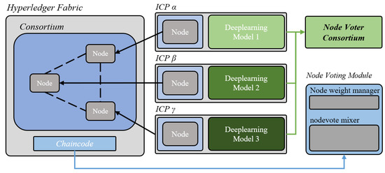 Unlike the general ensemble of deep learning, the mixing of the nodevote mixer utilizes only the result of the deep-learning model in the form of a black box. The proposed system does not expose the strategy of each service by using only the results derived by the node model without limiting network parameters, such as loss of the node model. This induces a situation in which it is assumed that ICP nodes of hostile interest will continuously develop the node model for operating profit through a compensation policy in the blockchain environment. The weight of the node model can be evaluated as the technical reliability of the ICP, creating trust value for the enterprise. Nodevote mixing is described in detail in Section 3.3.3. Aggregation and Integrated Votes.