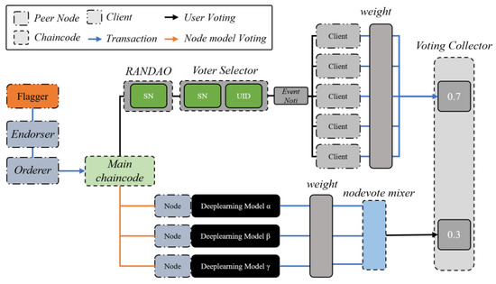 Figure 9 shows the process configuration of node model voting. In the proposed system, different deep-learning models driven by ICP nodes can be used, and their accuracy can vary significantly depending on the hardware performance of the service server and deep-learning model’s network parameters. The proposed system adjusts the influence of the node model on the overall integrated voting through neutrality and objectivity evaluation of node models of different specifications. The node objectivity evaluation index updates the voting weight through node evaluation by the possibility of continuous model development. Equation (4) shows the calculation of the voting weight through the node evaluation performed in the network.