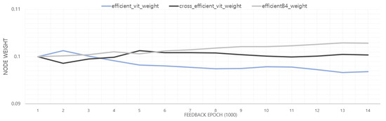 Figure 14 shows the change in the node weight value of the node model during each feedback epoch for the node reliability evaluation. As the experiment proceeds with the node model fixed, the node weight converges similarly to the accuracy distribution of each model. EfficientViT, cross-EfficientViT, and efficientNetB4 were assigned as the three nodes in the experimental environment. The hardware and environmental performance of each node were identical. Figure 14 shows that the real-time node reliability evaluation for node weight measurement is performed stably as the epoch progresses. The accuracy of each node model is directly related to node reliability, correcting the node model’s contribution to the integrated vote. Each feedback of the node reliability evaluation has 1000 frames of examples and a 1%p change range.