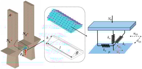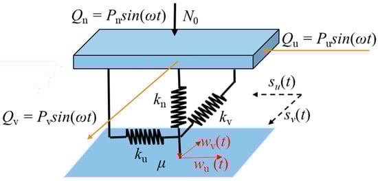 The contact pressure changes with the movement of the contact pair and a three-dimensional variable positive pressure friction model are shown in Figure 3. N0 represents the normal initial positive pressure acting on the contact element; su(t) and sv(t) represent the displacements of the mass in two directions; ku and kv represent the shear spring stiffness in two directions, kn represents the normal spring stiffness; wu(t) and wv(t) represent the displacements of the friction damper in two directions; Qu and Qv represent the external excitations along the two directions, and Qn represents the normal external excitation. μ represents the friction coefficient between the contact surfaces.
