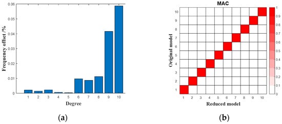 As shown in Table 1, in comparison to the original model, the CB reduction reduced the model size by about 20 times. The frequency difference and modal assurance criterion (MAC) values of the first 10 orders before and after the model reduction are presented in Figure 2 and Table 2. Obviously, the frequency difference in the first 10 orders before and after the model reduction was less than 1/10,000, and the MAC values were close to 1, indicating that the dynamic characteristics of the model before and after the reduction were basically consistent with the original model.