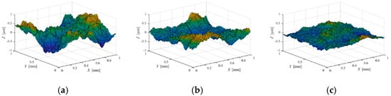 Simulated fractal surface profiles under different three-dimensional fractal dimensions; (a) D = 2.2, G = 1 × 10−8; (b) D = 2.3, G = 1 × 10−8; (c) D = 2.49, G = 1 × 10−8.