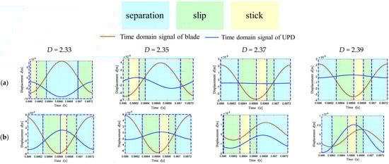 Contact state between UPD and blade when the fractal dimension D changes; (a) excitation forces in the same direction; (b) excitation force in the opposite direction.