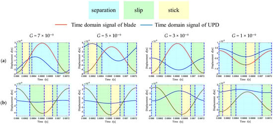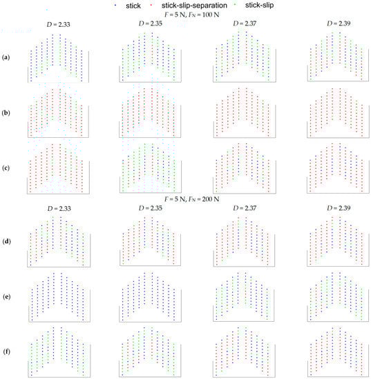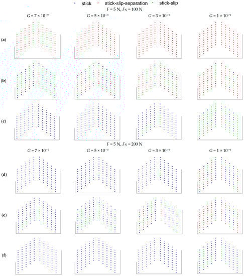 Taking the contact pair of UPD slices in Figure 6a as an example, in a complete vibration cycle, the influence of codirectional vibration and reverse vibration on the contact state was obtained under different levels of roughness. As shown in Figure 7 and Figure 8, under certain calculation conditions, different contact states of stick, slip, or separation at different times appeared on the contact surface. Therefore, different contact conditions can have different nonlinear phenomena.