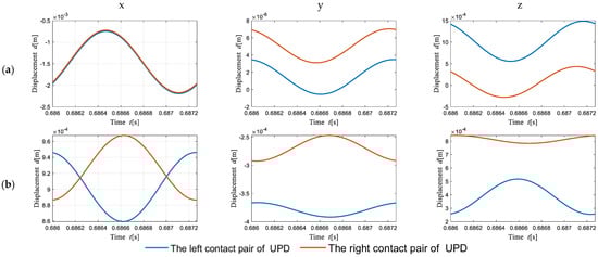 The co-excitation force and the reverse excitation force had different effects on the vibration of the UPD, as shown in Figure 6b. The symmetrical nodes on both sides of the UPD were selected as the analysis objects to calculate the time-domain vibration signals. As shown in Figure 9, in the case of co-excitation and reverse excitation, there were vibrations of the UPD nodes on both sides in three directions. As can be seen, the movement of the UPD was translational when the excitation forces moved in the same direction, whereas the UPD produced torsional motion when the excitation forces moved in opposite directions.