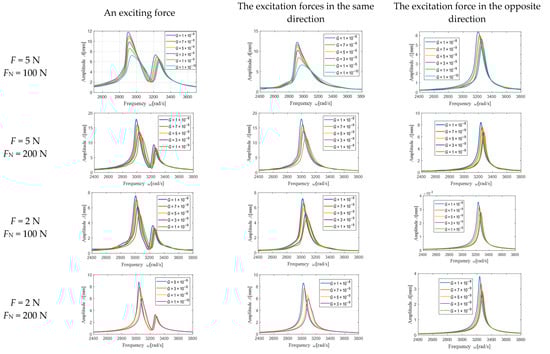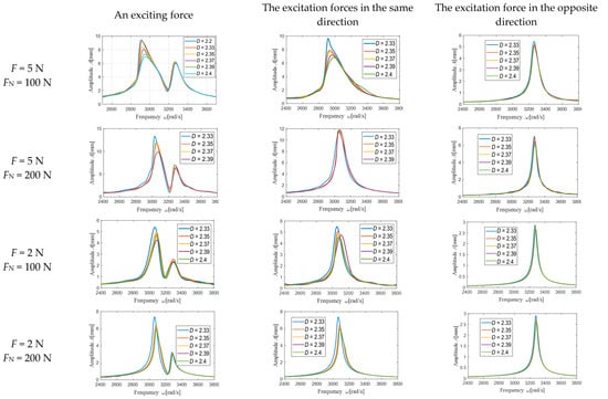 The vibration reduction characteristic curves of the different roughness fractal dimensions D of the contact surface under the three excitation conditions are shown in Figure 12. The exciting force is F and the centrifugal force of UPD is FN. Each curve corresponds to different fractal dimensions D. Under a single excitation force, there were two resonance peaks in the amplitude–frequency curve of the response point, and the blade vibration in the same direction generated a larger peak. With the application of the roughness formula, when the fractal dimension D was too large, the contact surface stiffness was large. The stiffness at this time did not conform to the real situation. Therefore, when the fractal dimension D was different, the blade resonance peak tended to move to the left, showing a nonlinear phenomenon. The reasons for this phenomenon are explained in Section 5.2. Furthermore, the resonance peak decreased with the increase in the D, and the reverse vibration peak of the blade was small and did not change much. In order to verify the vibration of two peaks when a single excitation force vibrated, the same-direction excitation forces and the reverse excitation forces were applied to the blade. With the increase in the D, the resonance peak of the blade decreased, and the change rule was the same as that of the single excitation force.