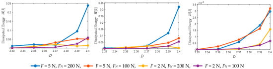 The dissipation energy changed with the roughness of the contact surface at different fractal dimensions D, as shown in Figure 13. Given that the whole contact surface was simulated by 110 contact pairs, the dissipated energy of the whole contact surface under a vibration period of the blade was obtained by analyzing each contact pair combined with the contact state in Section 5.1. In this study, when the excitation force was different or the centrifugal force was different, the dissipation energy increased with the increase in the D. However, when the single excitation force and the co-directional excitation force were applied, the phenomenon of first increasing and then decreasing occurred. Due to the fact that the contact surface was too rough, the contact state was in a complete stick state. Thus, there was no dissipation energy.