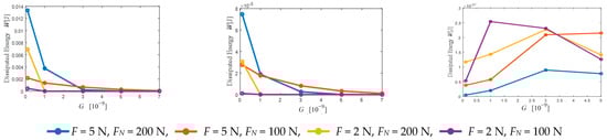The influence of the G on the damping characteristics of the under-platform damper is presented in Figure 14, with each curve corresponding to different levels of G. The resonance peak of the blade decreased with the decrease in the G under different excitation forces, and the resonance peak of the blade also tended to move to the left, which was also a manifestation of nonlinear phenomena. As shown in Figure 15, the dissipation energy declined with the increase in the G of the contact surface, and different phenomena occurred when the reverse excitation force acted. The amplitude–frequency curve under the reverse excitation force reveals that the vibration amplitude was small at this time, and Figure 10 in Section 5.2 shows that the contact surface state under the reverse excitation force did not change significantly with the roughness parameter G and was almost in a complete stick state. Therefore, the dissipation energy was very small at this time, and the maximum value was 2.5 × 10−21 J, which can be ignored.